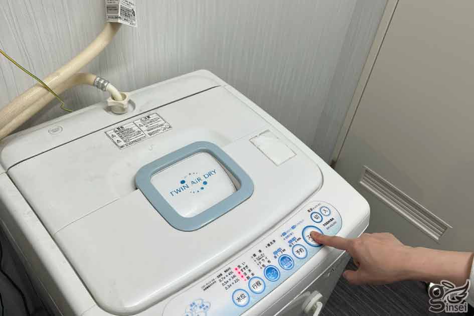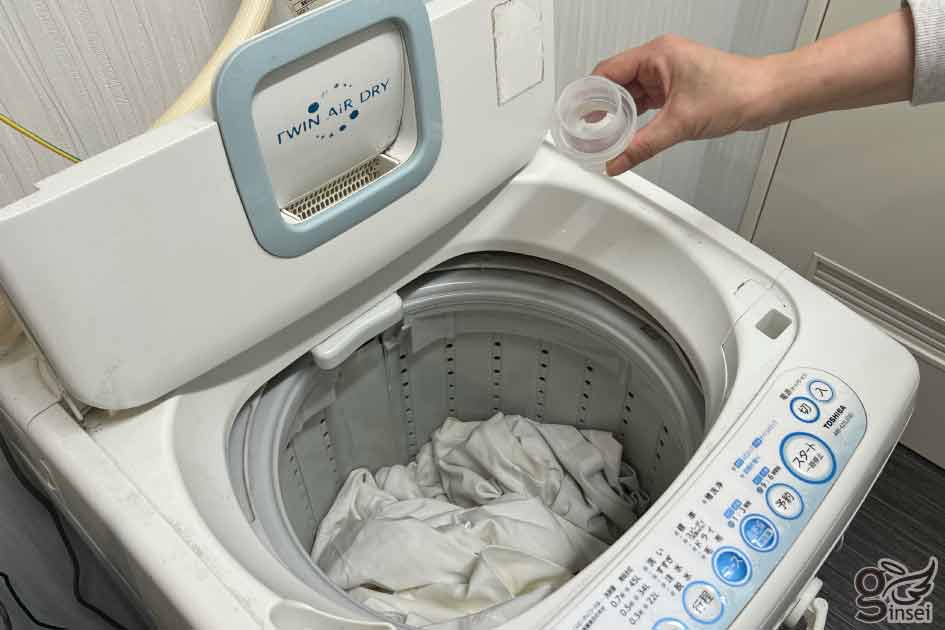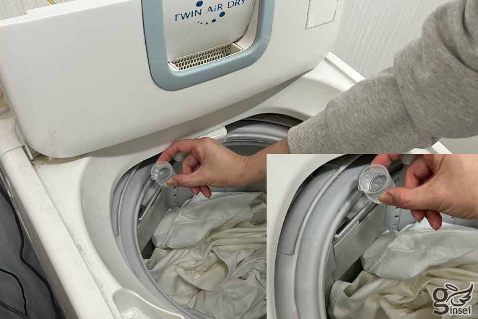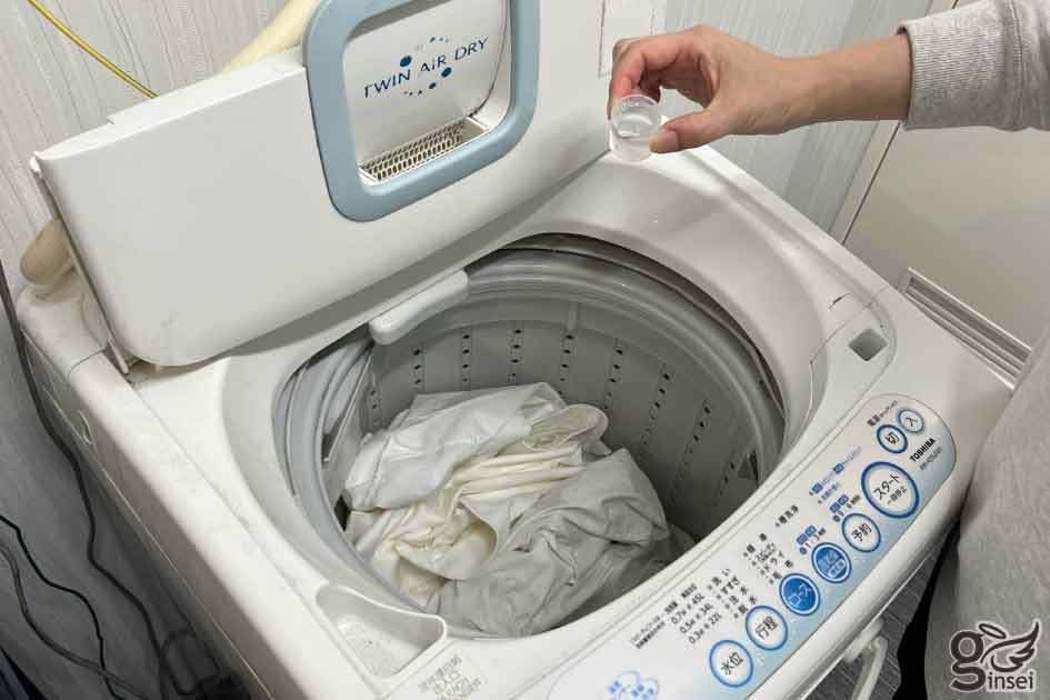 - 洗濯抗菌リキッドがよく混ざったら、洗濯物を投入し2回目のすすぎ洗いをします。洗濯物を揉み洗いした後、1分ほど放置します。