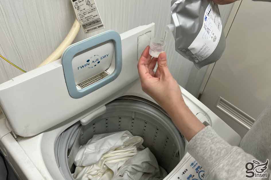 洗濯機へ洗濯物を入れ、普段お使いの洗濯洗剤を規定量投入してください。洗濯機によっては専用の洗剤投入口があります。ご使用になる洗濯機に合わせご利用ください。