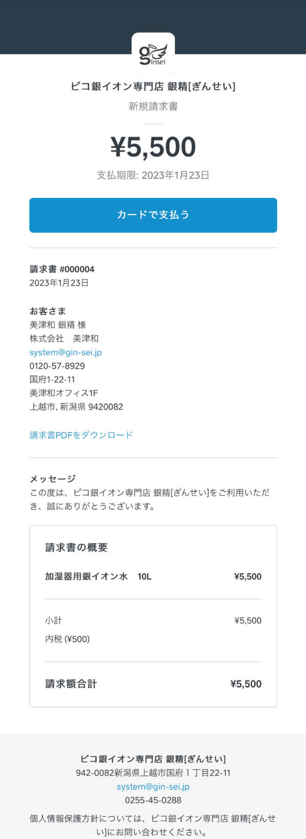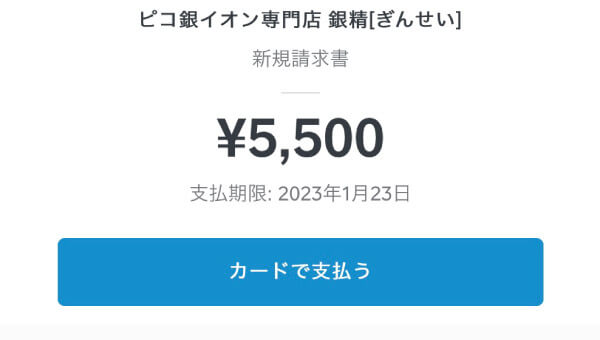 ピコ銀イオン専門店 銀精-ginsei-のクレジットカード払い(オンライン請求書)は、世界中で信頼と実績のあるSquare株式会社のカード決済システムを導入しております。当店が発行するオンライン請求書のサンプルはコチラをご覧ください。